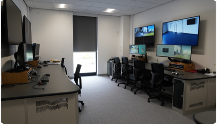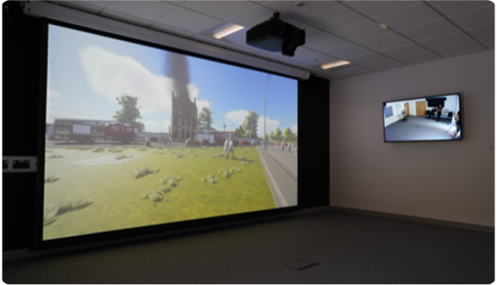 Specialist desks house the simulation PC’s and large displays show CCTV images from around the suite.